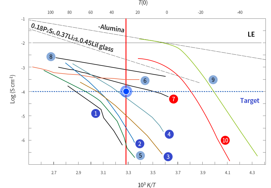 그러나 기술적 난관으로 고체 전해질로서는 완전한 필름상태에서 상온에서 σ≥10-4 S/cm 의 전도도에 도달하는 것이 어렵습니다.